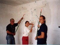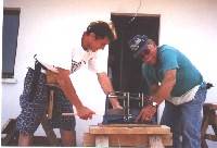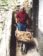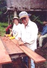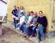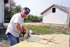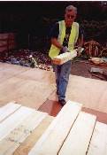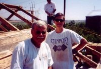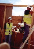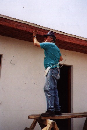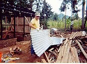 of his co-workers as he climbs a ladder to nail the lumber he "hauled" and sawed earlier.